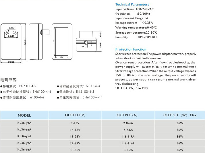 頻率:50/60Hz 輸入電流:1A 漏電電流:≤0.25A 工作溫度:0-40℃ 貯藏溫度:-20-80℃ 濕度:10%-80%RH 短路保護: 電源適配器在短路解除時能正常工作恢復 過流保護:過流故障排除后,電源將自動恢復正常工作 過壓保護:當輸出電壓超過額定電壓的150-180%時,電源將保護,故障排除后電源能恢復正常工作" />