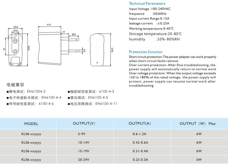 頻率:50/60Hz 輸入電流:0.15A 漏電電流:≤0.25A 工作溫度:0-40℃ 貯藏溫度:-20-80℃ 濕度:10%-80%RH 短路保護(hù): 電源適配器在短路解除時(shí)能正常工作恢復(fù) 過(guò)流保護(hù):過(guò)流故障排除后,電源將自動(dòng)恢復(fù)正常工作 過(guò)壓保護(hù):當(dāng)輸出電壓超過(guò)額定電壓的150-180%時(shí),電源將保護(hù),故障排除后電源能恢復(fù)正常工作" />